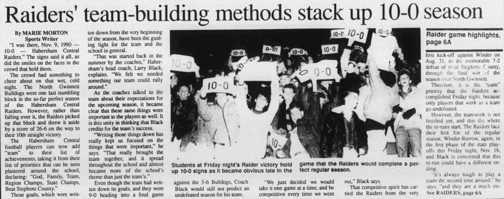 An article about the Habersham Central Raiders with a perfect 10-0 record. November 13, 1990 The Northeast Georgian
