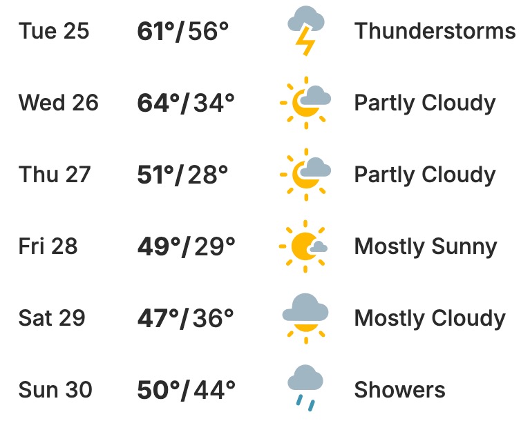 The coldest day is expected to land on Thanksgiving, with temperatures dipping into the upper 20s early in the morning before slowly climbing into the low 40s by afternoon. Wind chills during the early morning hours may feel even colder, especially in higher elevations around Clarkesville, Turnerville, and northern Habersham.
