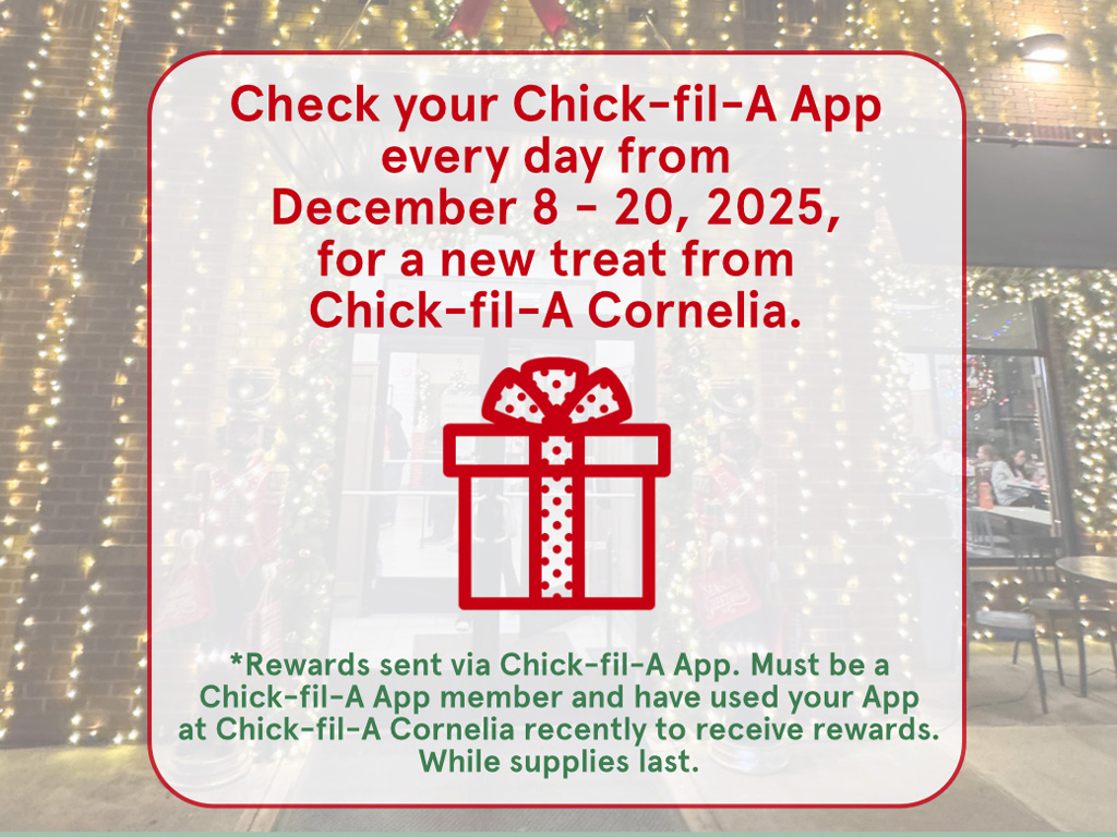 If you needed another reason to feel jolly this season, Chick-fil-A Cornelia has you covered! The restaurant is launching 12 Days of App Rewards, a festive countdown filled with daily surprises and free treats — all delivered straight to your Chick-fil-A app.