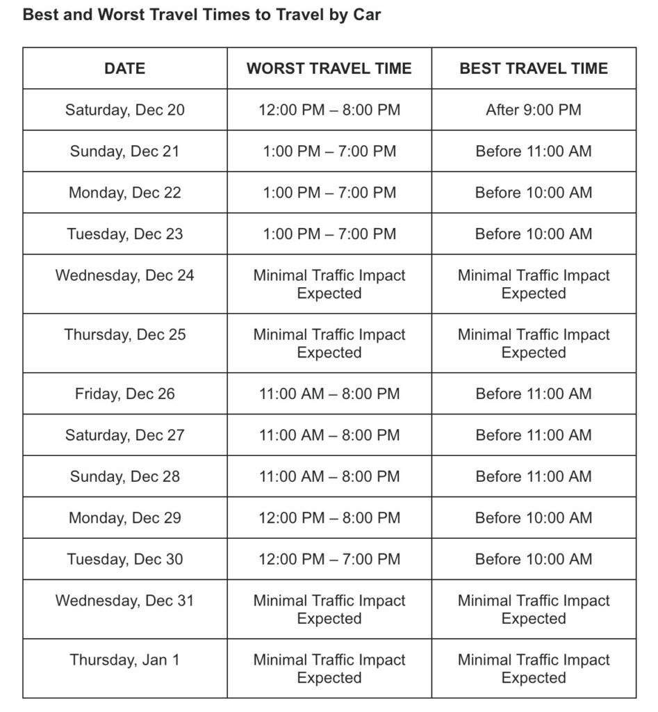 The Christmas travel period begins Wednesday, December 24, at 6:00 p.m. and ends Sunday, December 28, at 11:59 p.m. The New Year’s holiday travel period runs from Wednesday, December 31, at 6:00 p.m. through Sunday, January 4, 2026, at 11:59 p.m. Each travel period lasts 102 hours.