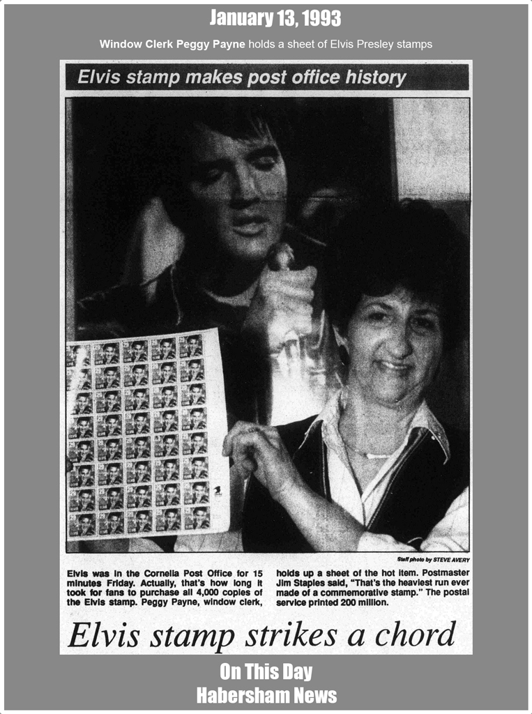 At the Cornelia Post Office, window clerk Peggy Payne proudly displayed a sheet of the newly released Elvis stamps, sharing in the nationwide excitement surrounding the tribute. Local demand was overwhelming — all 4,000 copies sent to the Cornelia Post Office sold out in just 15 minutes, underscoring the tremendous popularity of the issue.