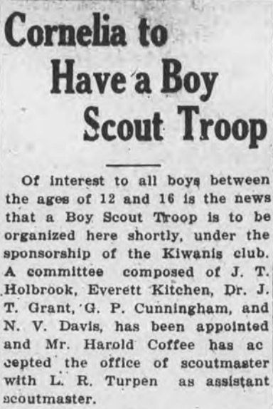 Troop 24 was sponsored by the Cornelia Kiwanis Club in June 1933, launching a partnership that has lasted for generations. Twenty years later, the troop celebrated a major milestone when Bron Forrester became Troop 24’s first Eagle Scout in July 1953, beginning a tradition of leadership and achievement that remains central to Scouting today.