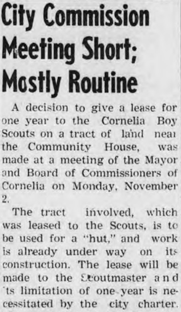 While the City of Cornelia owns the land where the hut sits, Troop 24 owns the hut. The city has recently renewed its lease agreement for the scout hut. Unlike in 1953 when the lease was only one year, the new lease is significantly longer, illustrating the city’s commitment to Troop 24.