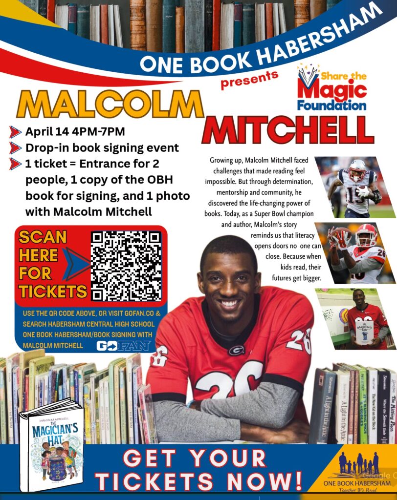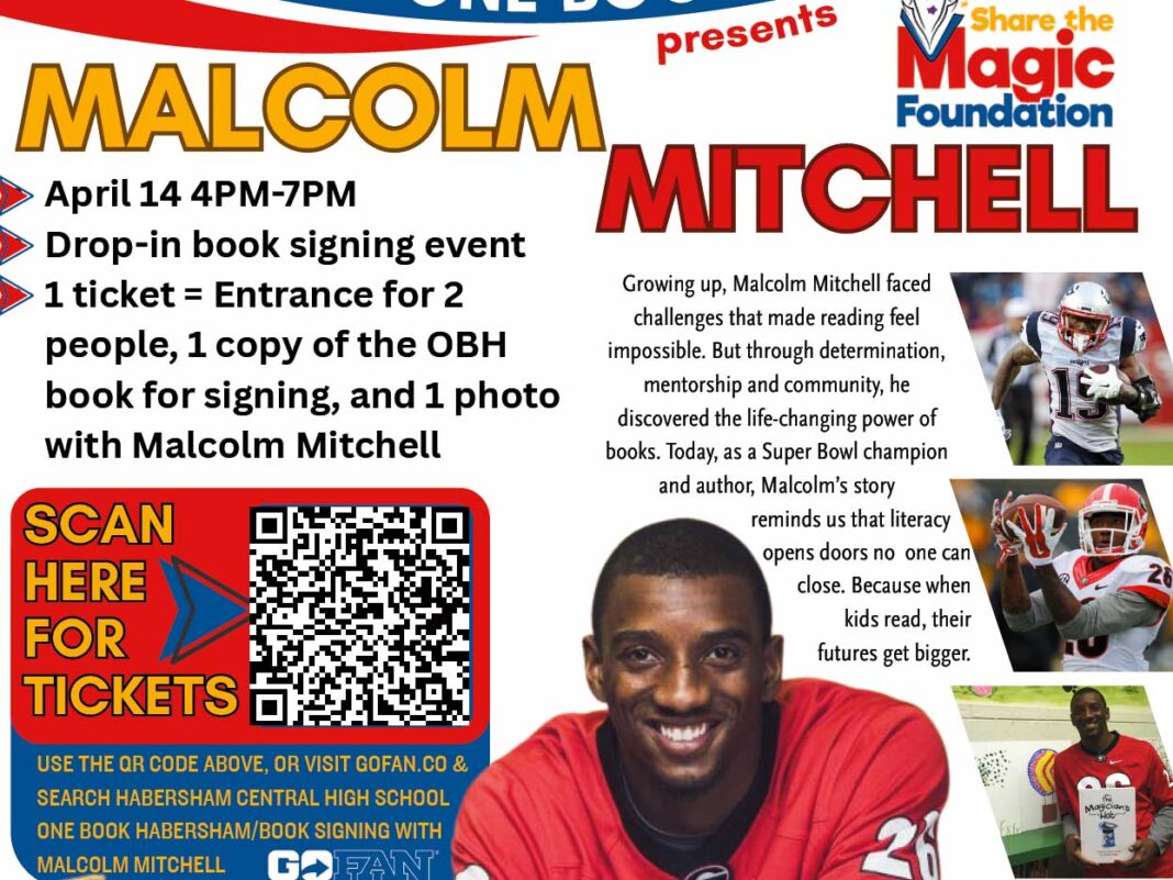 One Book Habersham, a partnership between Habersham County Schools, the Northeast Georgia Regional Library System, Piedmont University’s education department, and Volunteers for Literacy of Habersham County, will host Malcolm Mitchell for a public book signing event on April 14 from 4 p.m. to 7 p.m. at the Cornelia Community House.