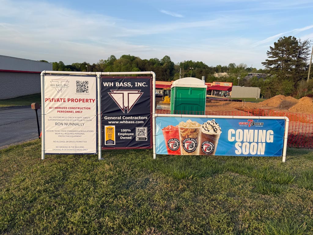 A temporary banner posted along the roadside confirms what many in the community have been anticipating: 7 Brew is “coming soon.”