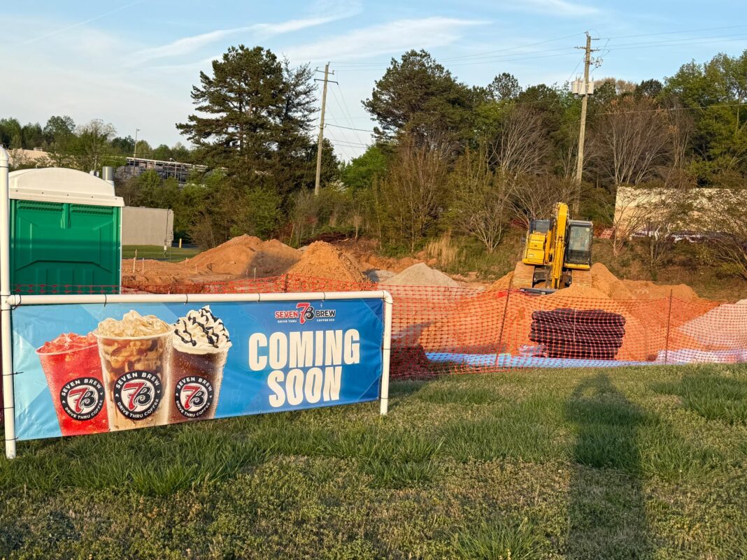 A temporary banner posted along the roadside confirms what many in the community have been anticipating: 7 Brew is “coming soon.”