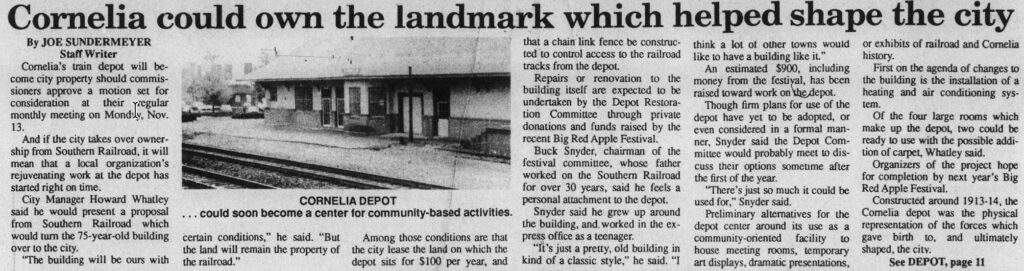 In 1989, Cornelia city manager Howard Whatley worked with Southern Railway to turn the building over to the city. It had previously been owned by Southern Railway/Photo Habersham History Archives